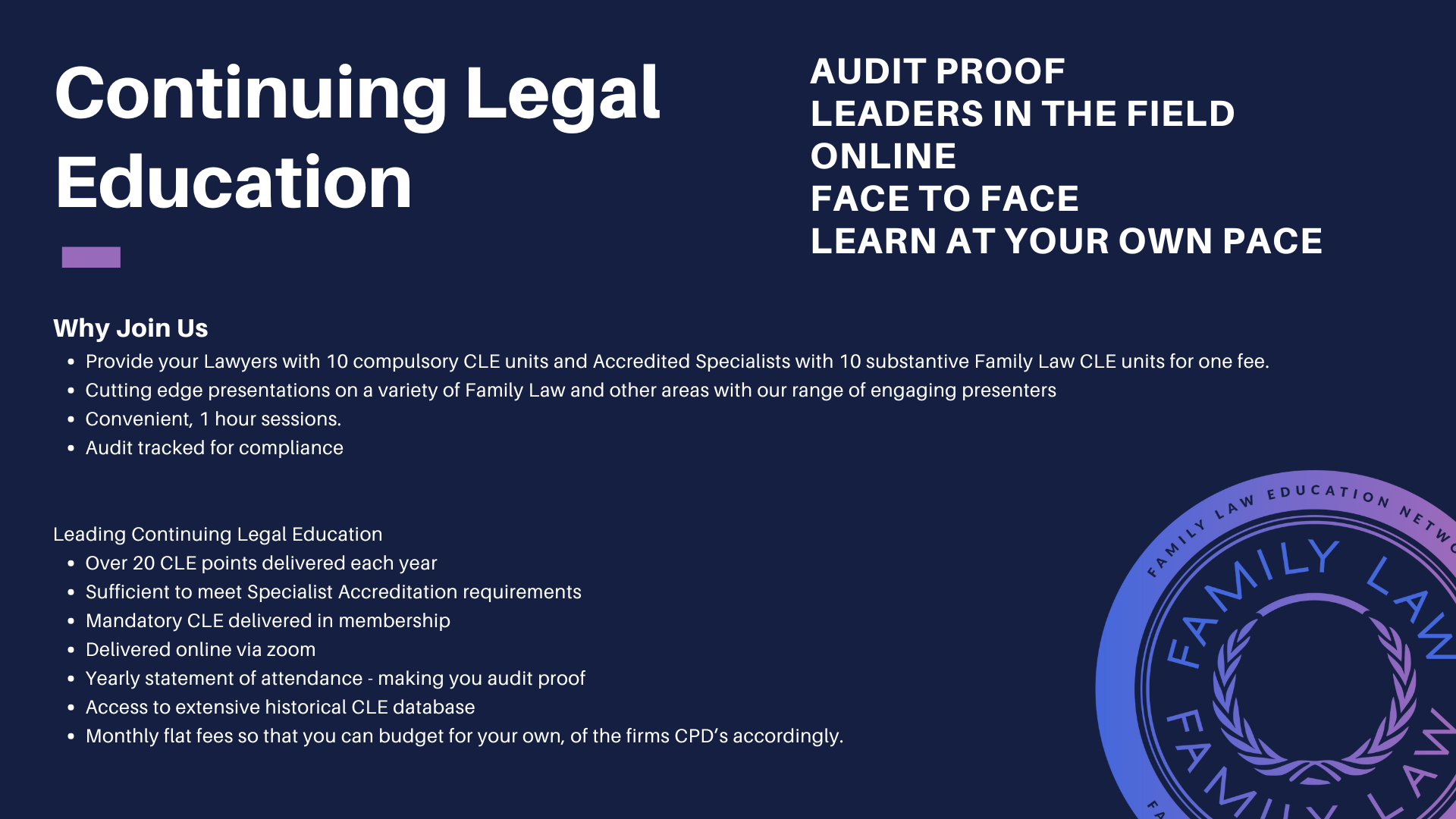 Ensure you meet your annual CLE requirements with our tailored programs. From core competency areas to specialised topics, FLENA has you covered.