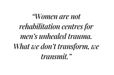 “Founded by my husband Matt and I, rooted in Matt’s lived experience of childhood trauma and family violence; the core message and invitation is that women are not rehabilitation centres for men’s unhealed trauma. It’s about encouraging men to take responsibility for their healing rather than seeking it from their partners or families. What we don’t transform we transmit!”